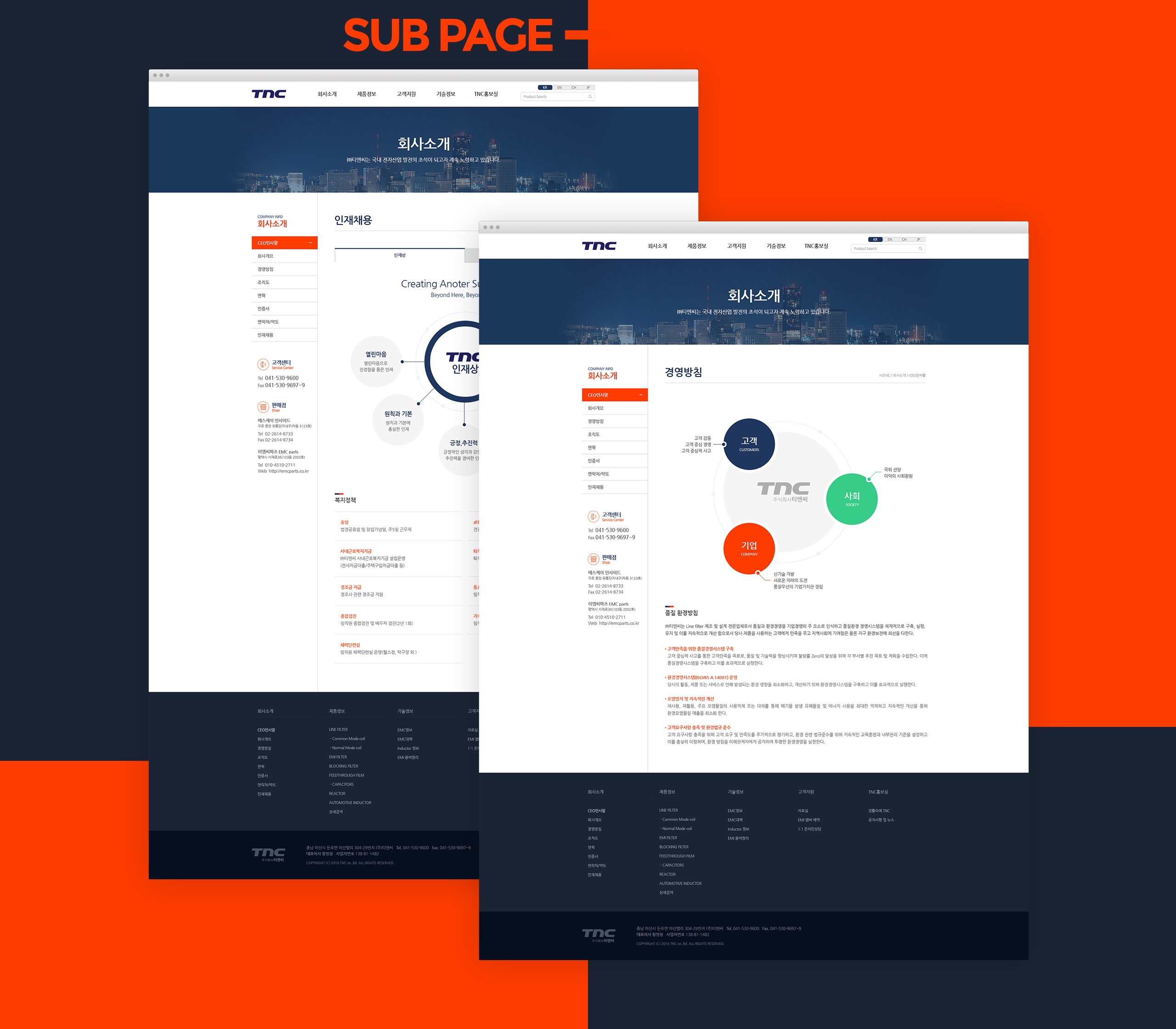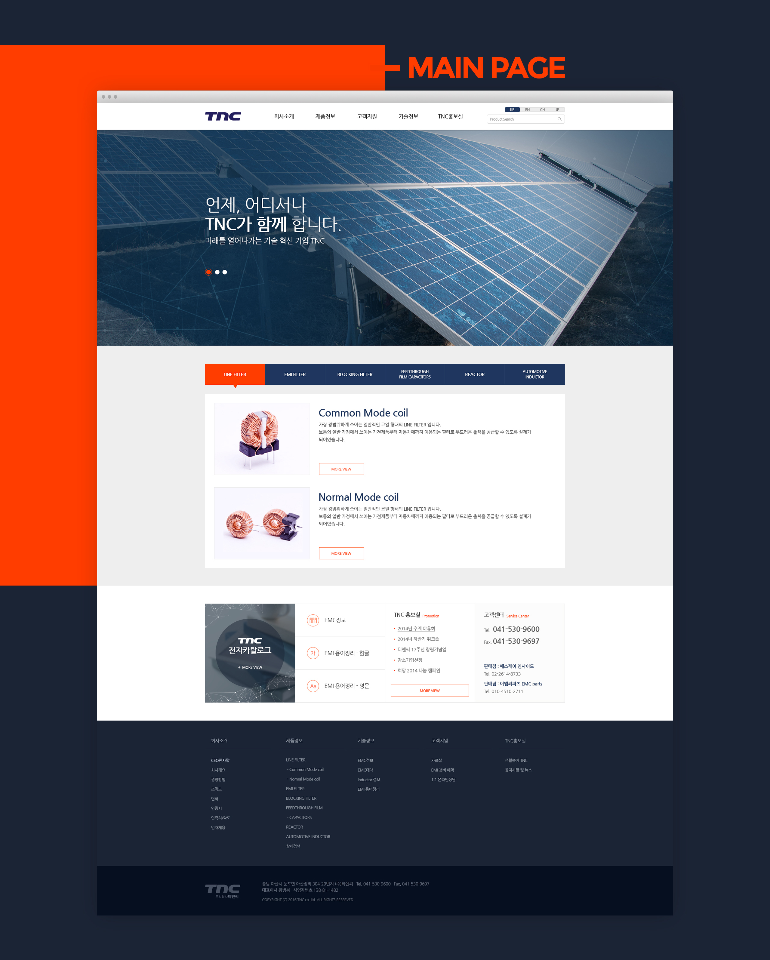 TNC 미래를 열어나가는 TNC TNC 기업사이트 프로젝트를 진행하였습니다. 제품에 들어가는 부품 소개를 가장 중요히 여겼던 프로젝트였으며 메인에서 주요 부품이 노출되게 작업하였습니다. 로고컬러인 네이비를 주 컬러로 사용하여 전체적으로 톤앤매너를 맞춰 작업하였습니다. Visit Website Client: 티엔씨 Website: tncltd.com Client Delivery Date: 2016-02 Design Participation Rate: main = 100% / content page = 80%